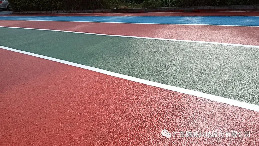 公司彩虹跑道實驗鋪裝已經(jīng)滿4年,含有紅、綠、藍三個顏色(其中一道為預(yù)制型卷材),表面沒有涂裝任何覆蓋層。歷經(jīng)4年,綠色的稍有褪色,紅色、藍色跑道面漆都沒有褪色;表面污漬較多、但都沒有粉化掉色。